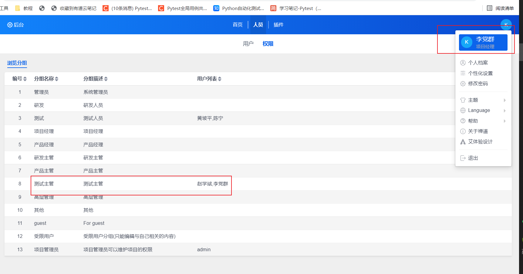 我首先设置自己的职务为测试主管,但是由于权限不够,我又升级我职务为项目经理,并给与所有权限,但是实际项目经理该有的权限我还是没有。