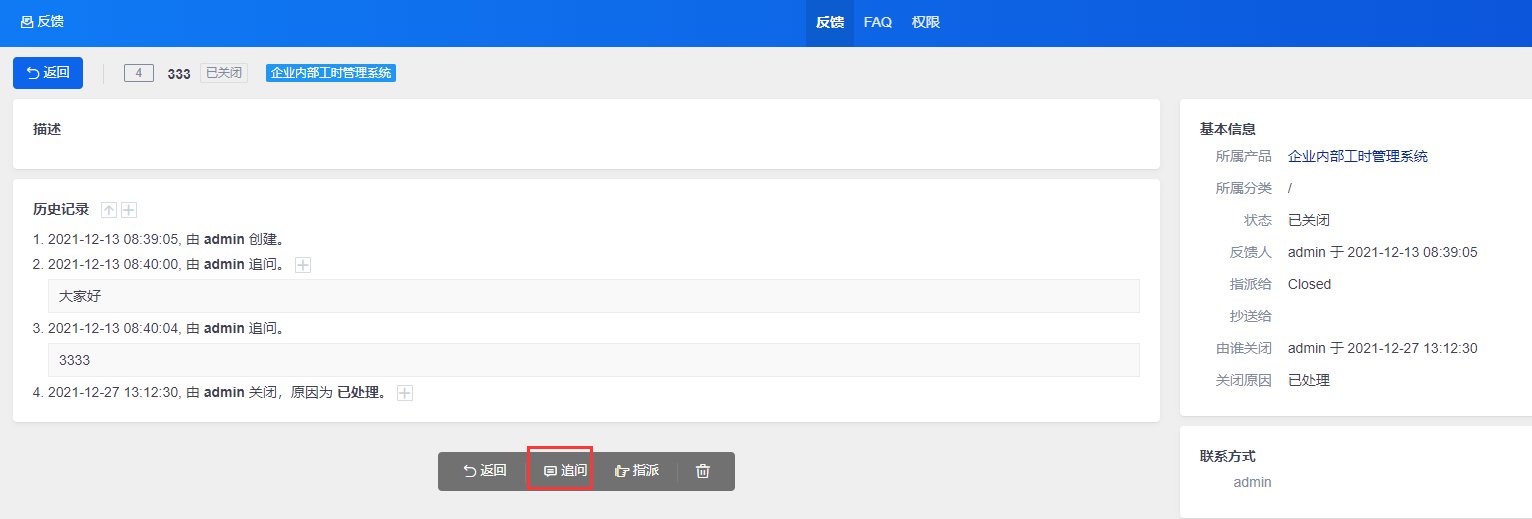 新版本中支持对已关闭的反馈进行追问,进行追问后可以再对反馈进行处理