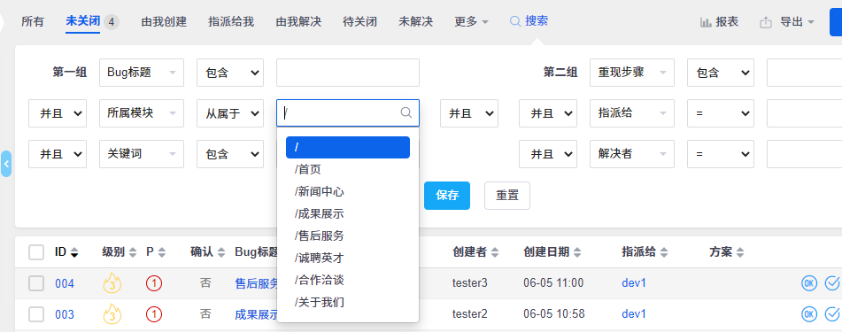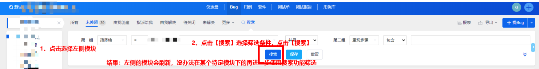 测试模块-点击选择左侧的【所属模块】-再点击搜索,选择条件,点击【搜索】,左侧的模块会一起刷新,无法在摸个特定模块下进一步使用搜索进行筛选