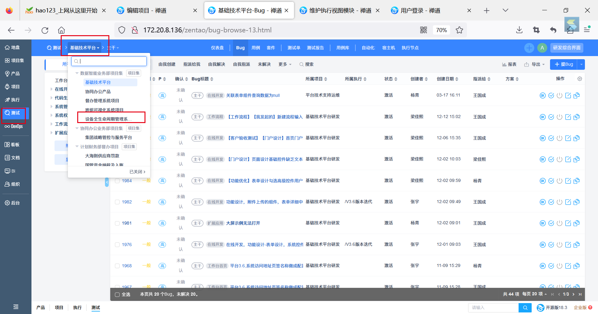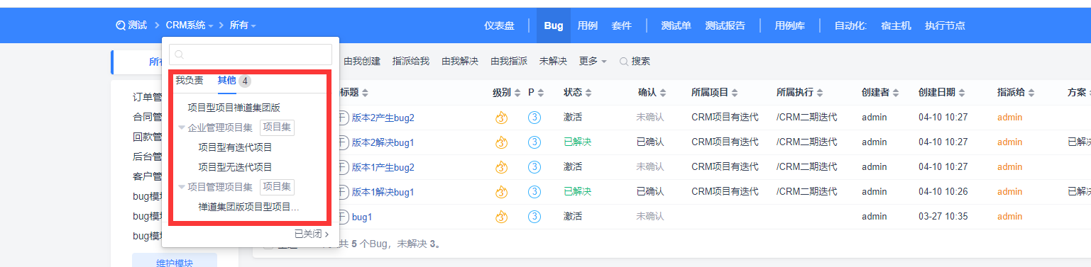 测试-BUG界面 这里的下拉为禅道系统中的产品,项目型项目因为是以项目为主体,所以没有出现在这个下拉框里,可以到具体的项目-测试界面查看下。