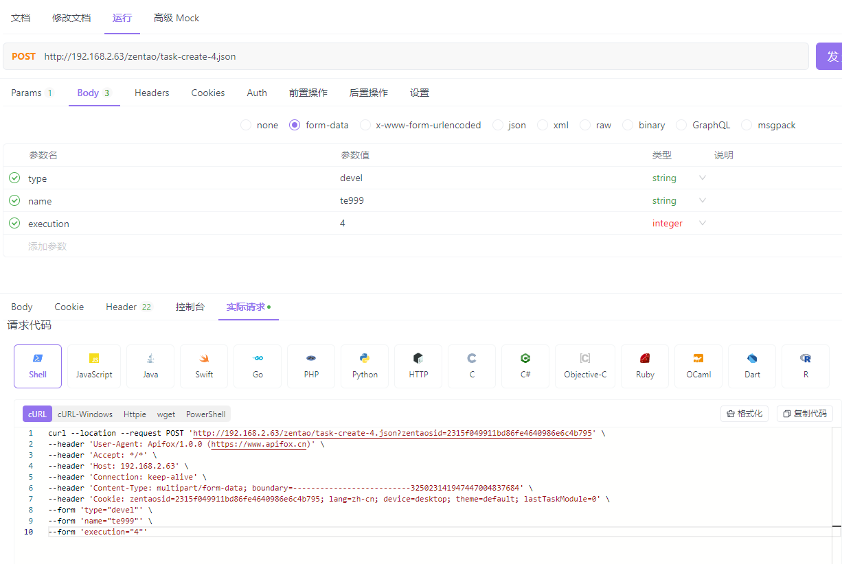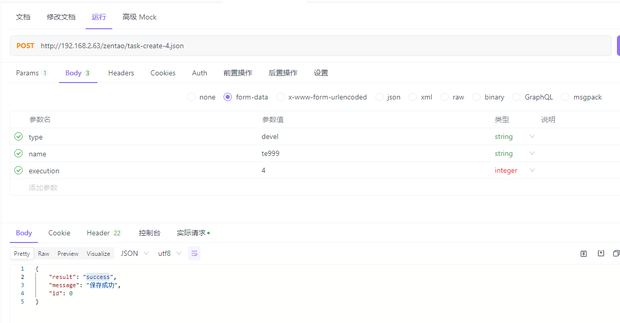 禅道开源版15.4,使用apifox创建禅道任务,返回成功但是实际上任务没有创建