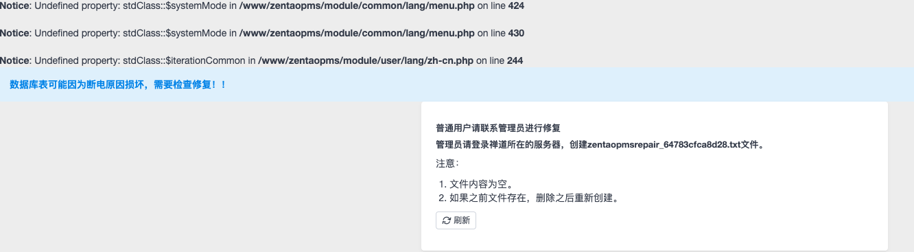 管理员请登录禅道所在的服务器,创建zentaopmsrepair_64783cfca8d28.txt文件。