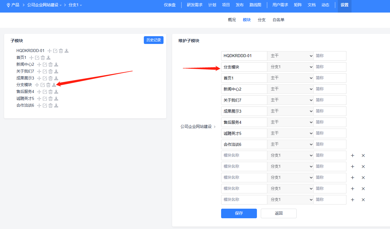 1、在分支的模块维护中添加模块,名为“分支模块”
