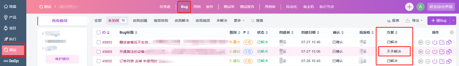我们的诉求是:仅项目经理角色有权限设置 项目中bug的解决方案为“不予解决”,以避免研发人员随意设置或更改。