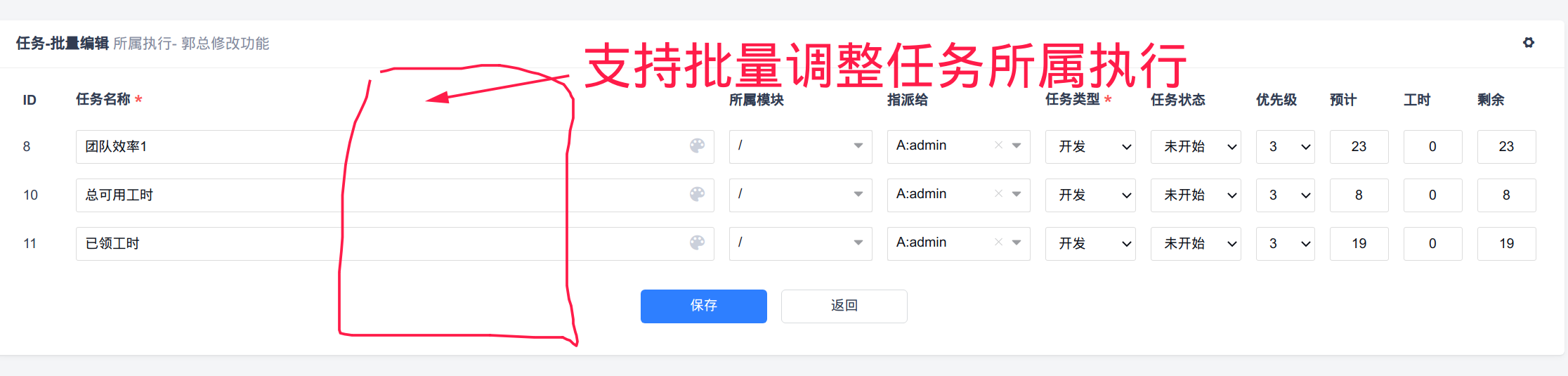 任务批量编辑界面,支持调整任务所属执行方便任务调整。