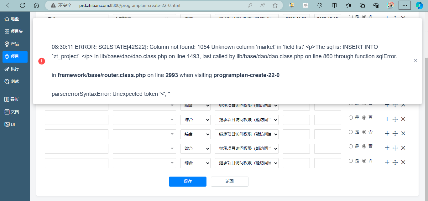 08:30:11 ERROR: SQLSTATE[42S22]: Column not found: 1054 Unknown column 'market' in 'field list' The sql is: INSERT INTO `zt_project` in lib/base/dao/dao.class.php on line 1493, last called by lib/base/dao/dao.class.php on line 860 through function sqlError.