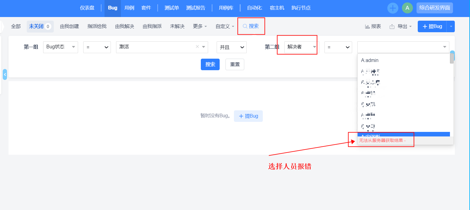 从18.0升级到18.9后,测试-bug模块,bug搜索条件里,人员列表报错,无法搜索到指定人员的数据。