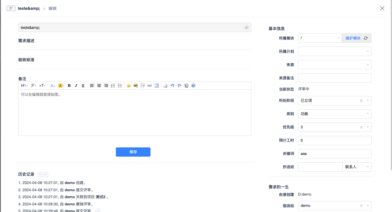 这个环境也复现了,就是创建或变更一个需求单,标题中带有&,然后下次编辑需求单随便改点别的,保存,标题就会出现这个