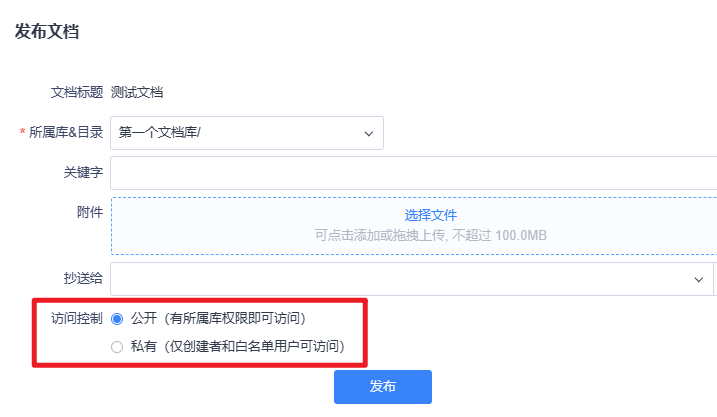 创建wiki文档,点击发布时可以设置公开或者私有;
