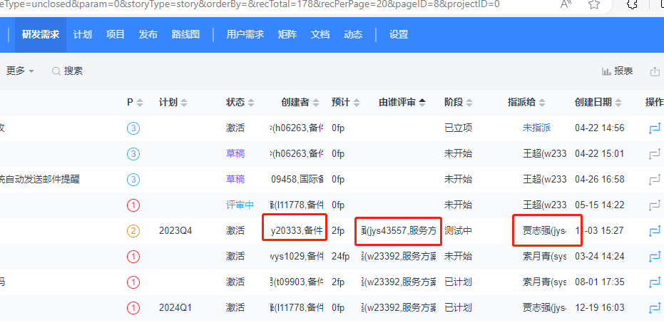 如下图所示需求展示列表中指派给谁列名称展示是名称左侧开始,创建者和由谁评审展示出的效果是用户名字的中间部分,导致用户无法看出是哪个用户