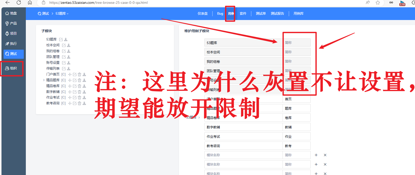 在用例下维护模块时,只能编辑在 测试->用例 菜单下创建的模块([c]表示)。如果需要维护灰色部门模块,需要到对应产品下。