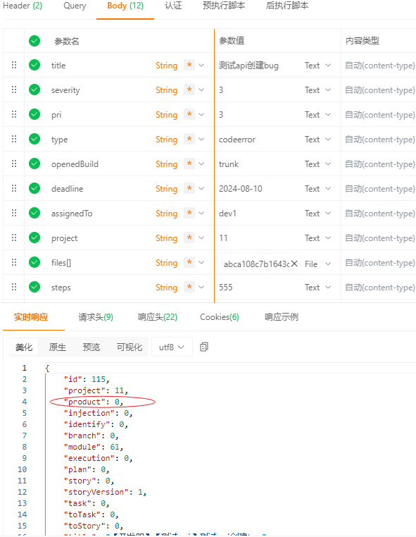 使用api创建bug后,在 仪表盘-我的bug位置没有新增bug,在右边的动态里有,手动在数据库修改product的值后,bug就可以显示了,想请问一下,api提交时如何添加product字段