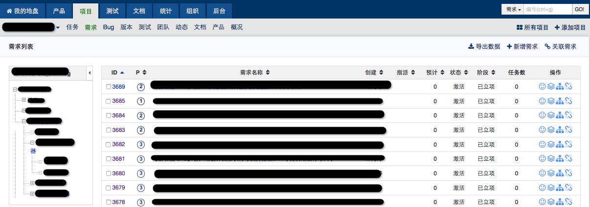 页面左侧为产品模块,点击相应的模块,系统可以根据模块对需求进行过滤,过滤出该模块的需求。项目视图-xx项目-需求(xx项目关联产品为yy产品)