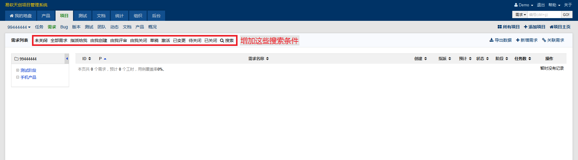 “项目->需求->需求列表“ 建议也可以有搜索条件,“项目->BUG->BUG列表“ 也类似,见附图