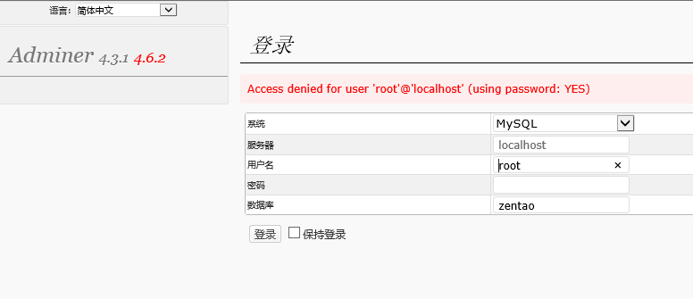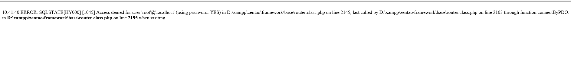 10:41:40 ERROR: SQLSTATE[HY000] [1045] Access denied for user 'root'@'localhost' (using password: YES) in D:\xampp\zentao\framework\base\router.class.php on line 2145, last called by D:\xampp\zentao\framework\base\router.class.php on line 2103 through function connectByPDO.