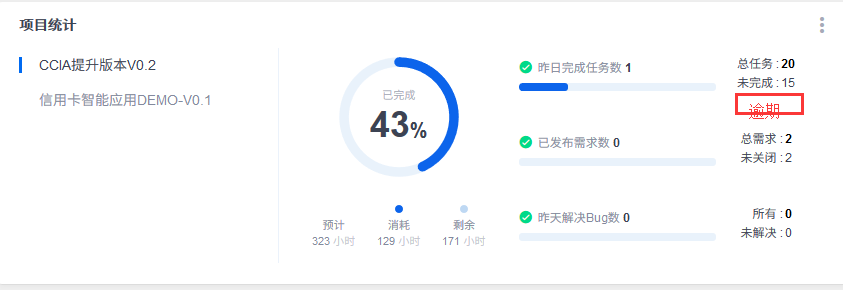 建议在项目的首页, 项目统计的区块中增加 逾期任务数的统计, 同时,增加点击直通到任务、需求、bug的功能