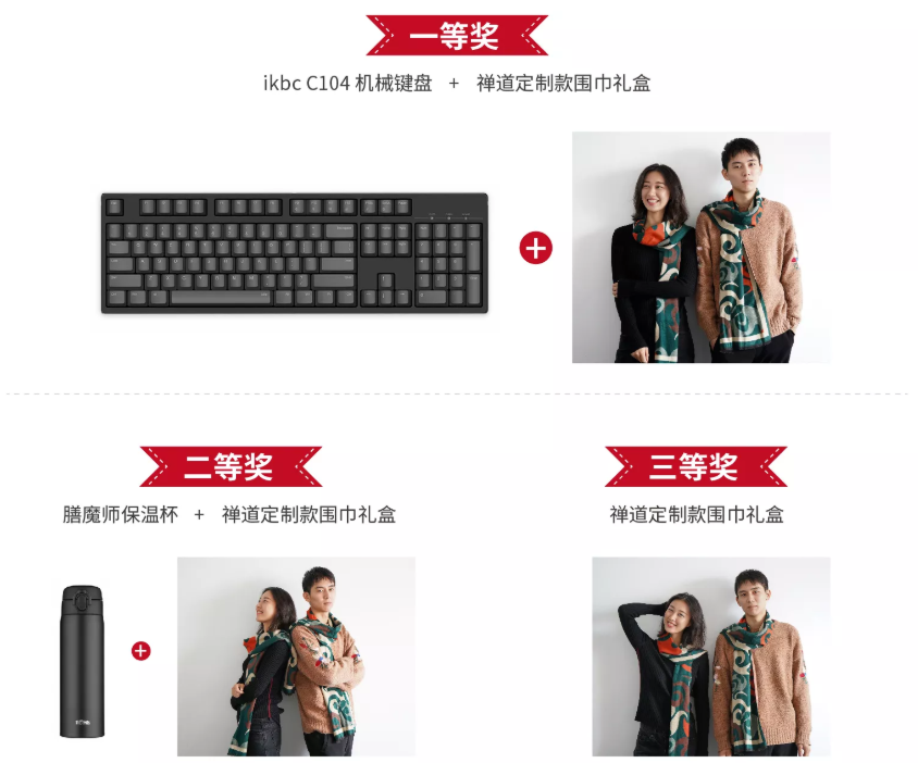 一等奖:2名, ikbc 机械键盘一个 + 禅道定制款围巾礼盒一份;