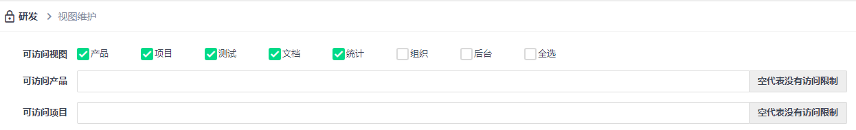 2.组织-权限,修改【研发】分组的视图权限,【可访问视图】取消【组织】、【后台】的权限,【可访问产品、项目】为空,保存。