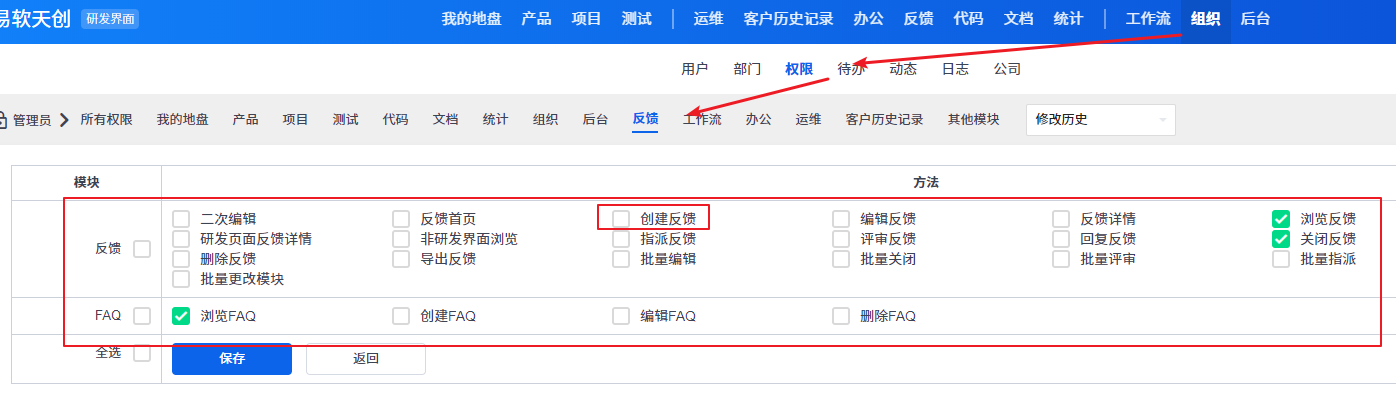 1. 需要在 组织- 权限 -权限分组添加下 创建反馈的权限;看不到创建反馈入口的账号,需要添加下 反馈首页 的权限;