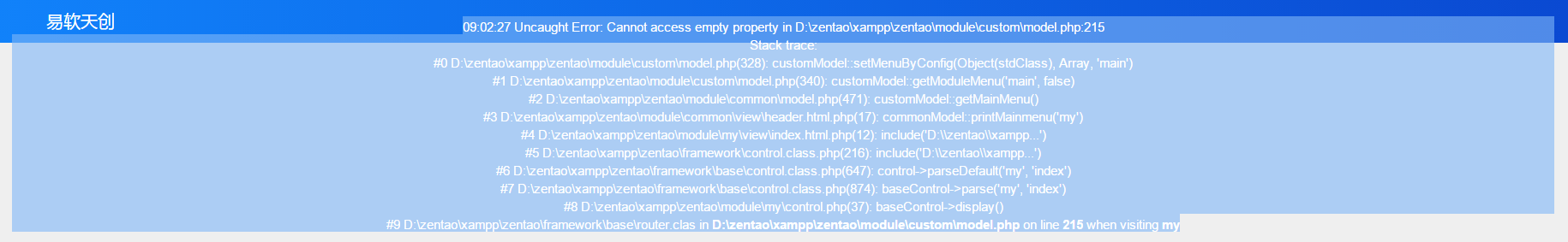 #9 D:\zentao\xampp\zentao\framework\base\router.clas in D:\zentao\xampp\zentao\module\custom\model.php on line 215 when visiting my