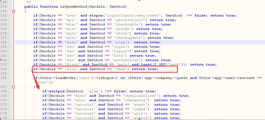 将 if($module == 'file' and $method == 'read') return true; 加入登录验证后未生效