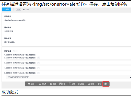 问题二中,任务详情页面复制任务功能( URL:http://xxxxx/zentaopms/www/index.php?m=task&f=view&taskID=691)存在XSS漏洞,升级到12.4.1版本后仍存在