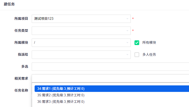 步骤7:回到项目上创建任务,此时新建的需求对应模块 没有在项目上显示,任务关联需求的时候没有显示