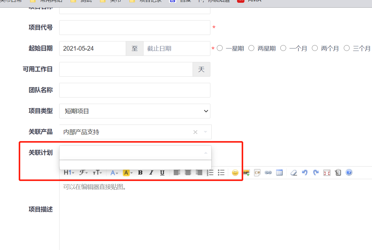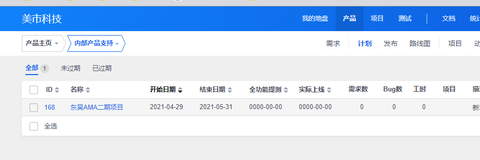您好,禅道系统中的计划管理是在产品维度下维护的,在创建项目选择关联计划时,需要先在项目关联的产品页面 创建计划的,可以检查下 "内部产品支持"这个产品是否有创建了计划呢?