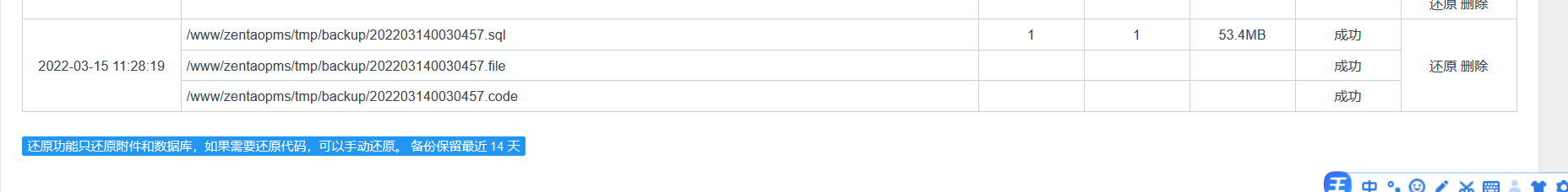 可以只把 202203140030457.sql.php 放到新服务器进行还原,然后将202203140030457.file目录下的文件拷贝到 新服务器zentao/www/data目录下,这样试一下。注意两套禅道版本要一致