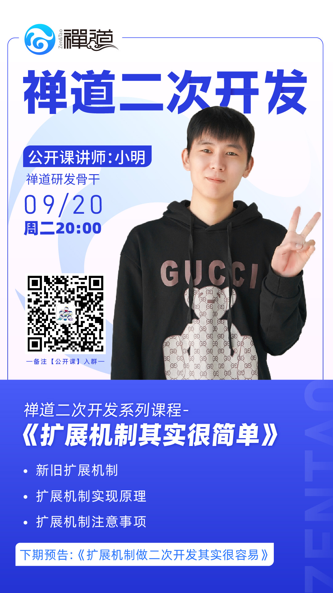 禅道二次开发系列公开课第二节课程来了!9月20日,一起跟着禅道骨干研发——小明老师一起学习拓展机制!