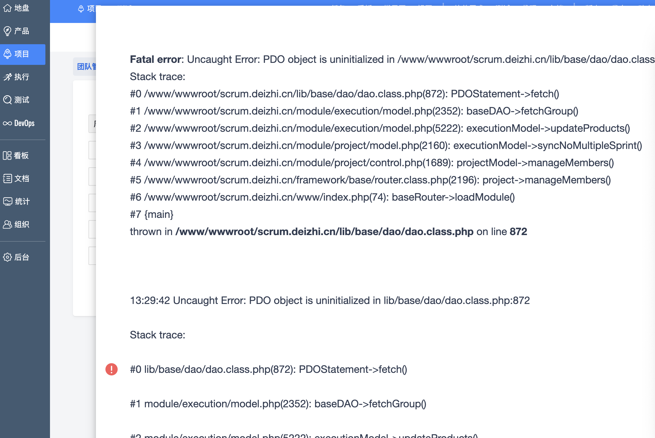 #1 /www/wwwroot/scrum.deizhi.cn/module/execution/model.php(2352): baseDAO->fetchGroup()