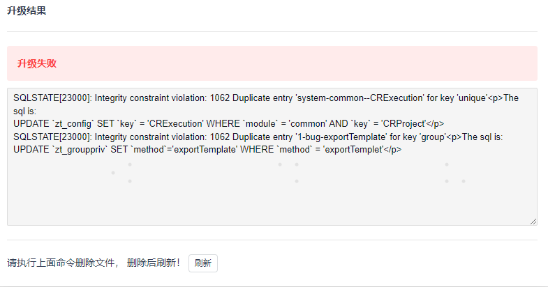 这个问题是升级过程被执行了2次的问题,咱们可以还原当前禅道到升级前的版本(数据库也需要还原到升级前的状态),重新升级看下,如果还是重现此问题,可以尝试升级前进数据库将zx_grouppriv 这个表的数据清空,再升级看下(操作前务必备份)