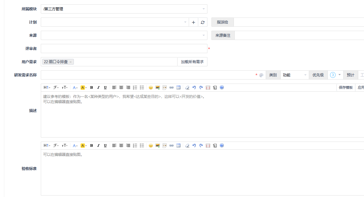 2.一般研发需求也是来自用户需求,对研发需求编辑时现在只能手动拷贝用户需求中的描述再进行调整;使用不是太方便,建议对此做个优化