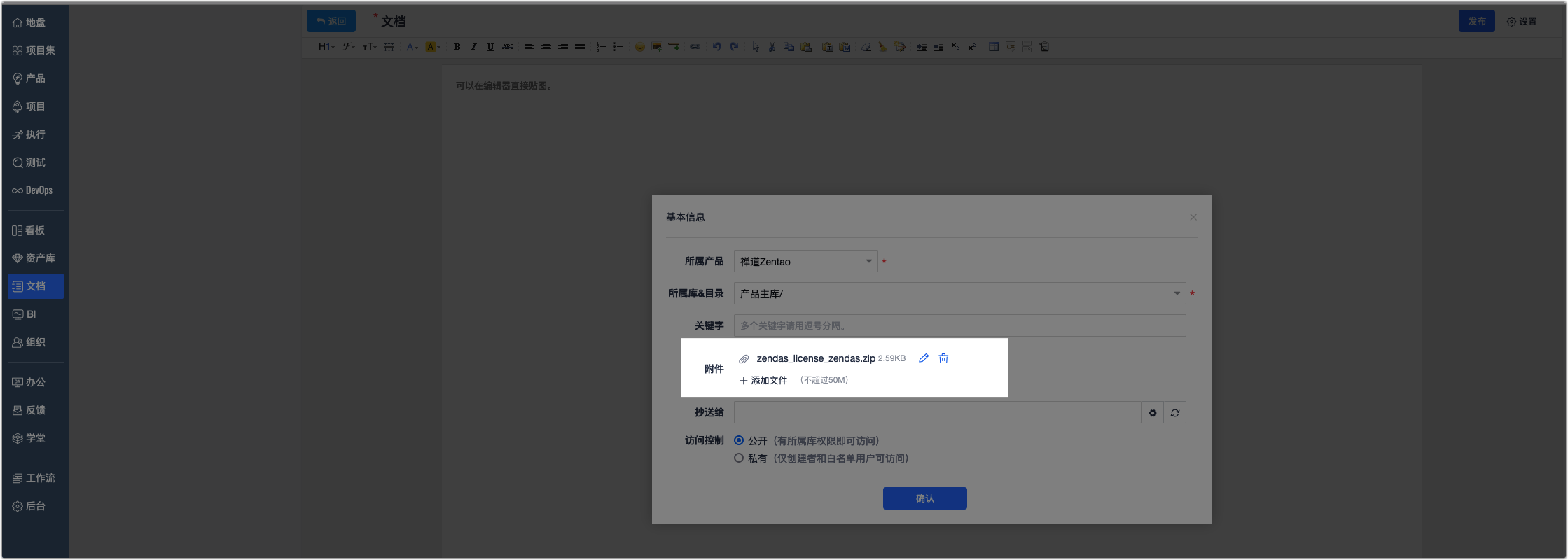 可以在需求,任务,bug,用例等模块下上传附件 , 也可以在产品 或者项目的文档库里面 ,新建一个文档上传附件信息