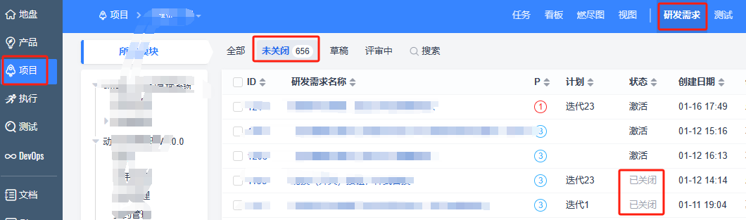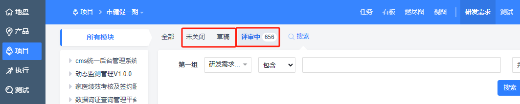 点击项目,点击研发需求,点击全部筛选,然后点击未关闭筛选,未关闭筛选下的数据和全部下的数据一致