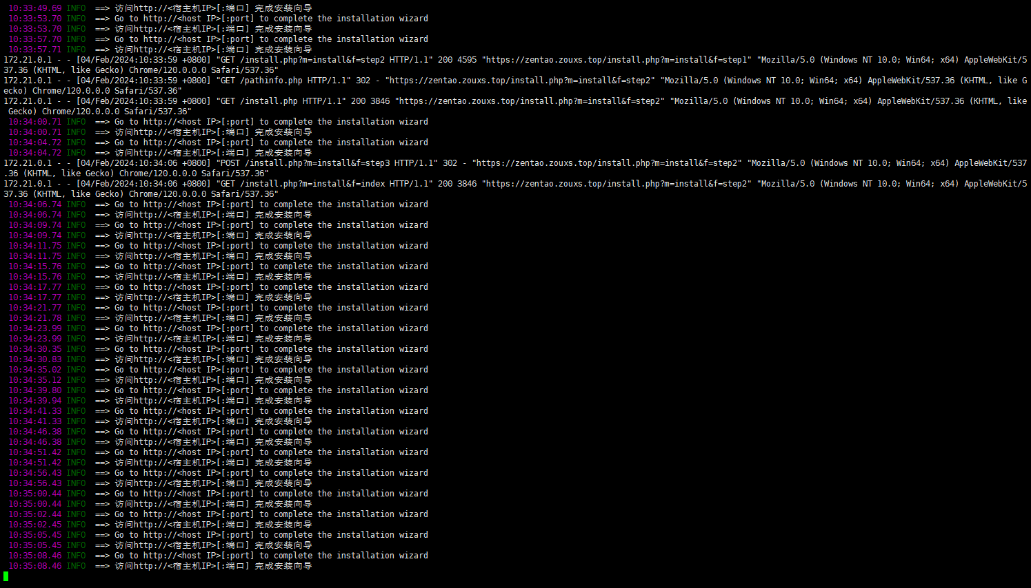 1、请问启动容器后访问禅道是通过域名访问的吗,可以直接通过ip+端口的方式访问安装禅道试试;