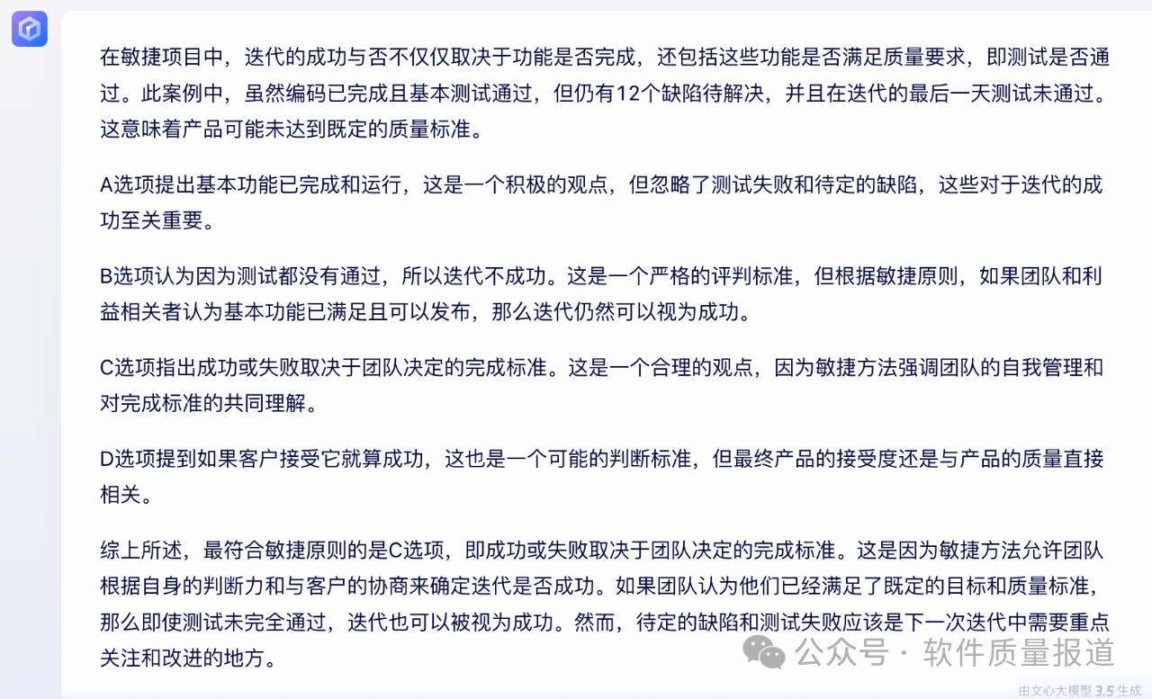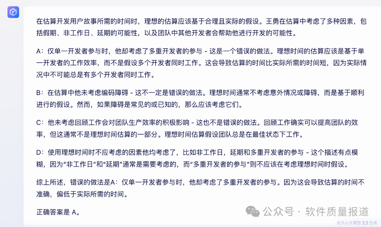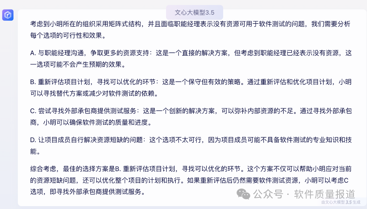 2)文心一言回答的第2题,居然答对了(A),因为另外3个大模型都答错了(都给出B),此处必须给文心一言点赞