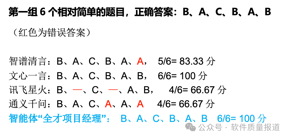 第一组题目做下来,它们的成绩如下,文心一言和智能体得满分,胜出。