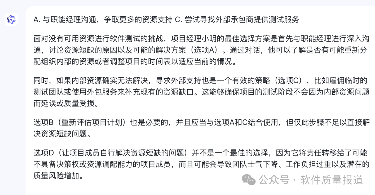通义千问的半对(机智吗?)回答,A是优先的,错的概率更大。也说明这题的选择是比较困难的。两个模型加上智能体都选A(3:2,错的概率大),题目没出好?