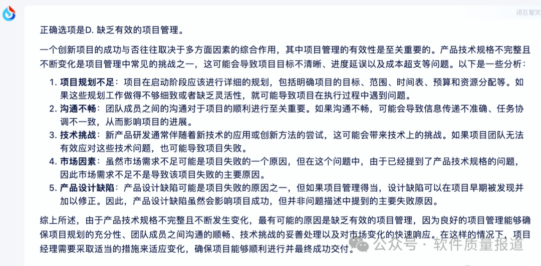 3)讯飞星火和通义千问都答对了第3题(D),也回答得很规范,而另两个模型都答错了(C)。