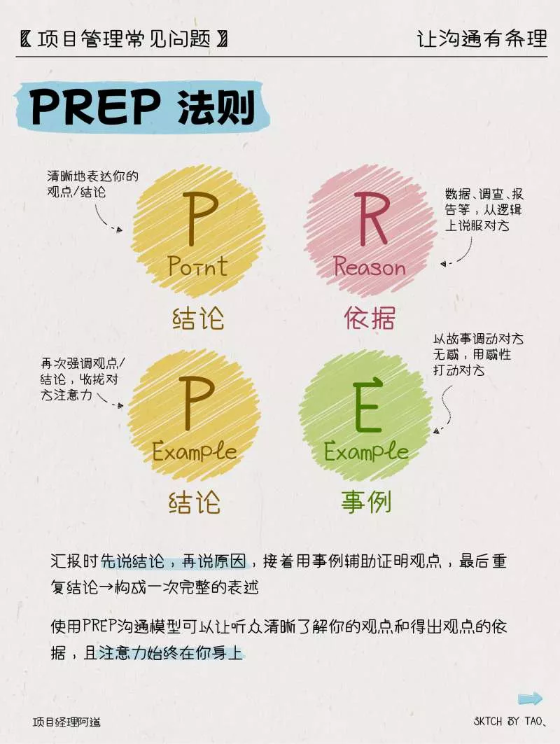汇报时先说结论,再说原因,接着用事例辅助证明观点,最后重复结论→构成一次完整的表述,使用PREP沟通模型可以让听众清晰了解你的观点和得出观点的依据,且注意力始终在你身上。