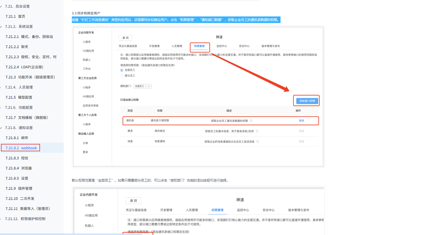 您好,禅道支持集成钉钉工作消息通知,在集成过程中,可以关联部门,实现该功能需要您在钉钉管理后台,创建“钉钉工作消息通知”类型的应用后,还需要同步和绑定用户。点击“权限管理”-“通知接口数据”,获取企业员工的通讯录数据的权限。请参考 https://www.zentao.net/book/zentaopms/38.html
