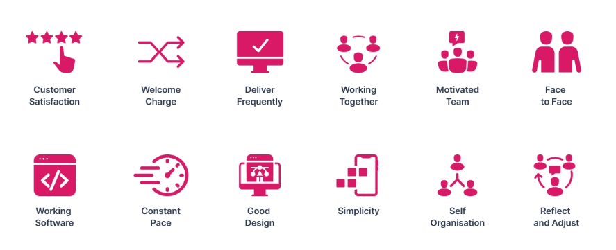 在此滞后期间,许多客户请求发生了变化,导致许多项目被取消。因此,2001 年,17 位领导人会面并签署了《敏捷宣言》,以改善这种情况。该宣言由四个基本价值观和十二条原则组成,这些原则定义了软件开发的过程。每个团队对它们的应用方式不同,但它们是向企业提供高质量软件的重要组成部分。敏捷宣言的四个价值观包括: