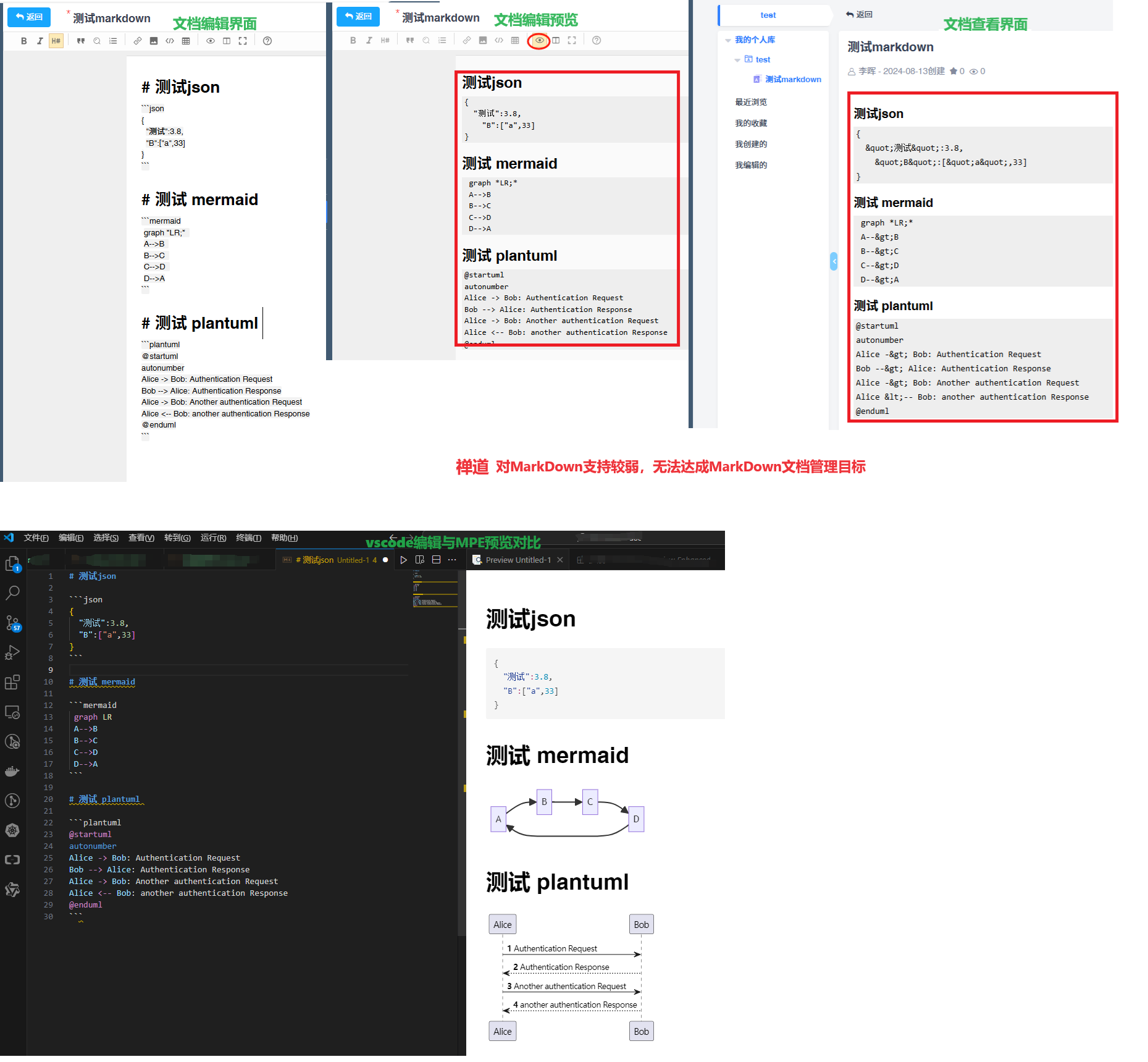 如下图,测试了3种语法(json、Mermaid、plantuml),支持均存在不同程度的问题。希望可以增加对markdown文档支持的增强。