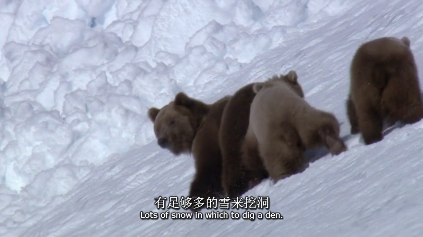 1、阿拉斯加地区冬眠醒来的灰熊妈妈带着灰熊宝宝艰难的沿着雪山到海岸边觅食。