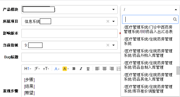当模块的结构层次较多时,默认的“产品模块”组合框宽度不足以在一行中显示,导致下拉列表中的内容显示较为混乱。