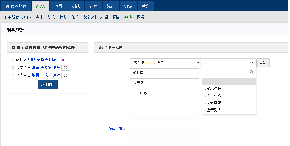 [bug]当有多个产品时,在"产品"页面选择"维护模块",会发现产品2变成了产品1的子模块