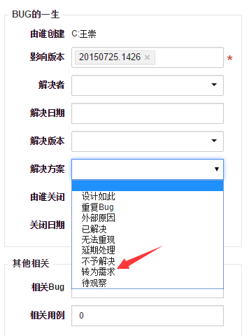 当编辑bug的时候,这个选项需要列出来,要不的话,当某个bug的解决方案是转需求的时候,而列表中没有该项,该字段的值就会发生变化。