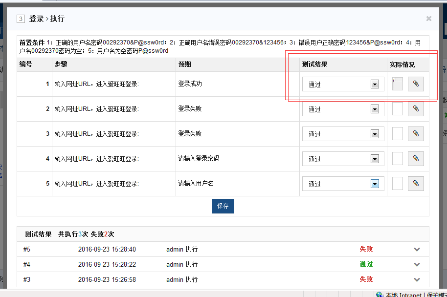 执行测试用例时,若默认测试结果通过,再输入实际情况时,则测试结果自动变更为失败