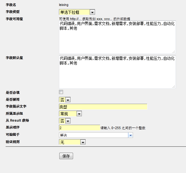 建议bug页面用户可以在后台自定义字段,这样用户可以更加细致的对提高的bug进行细分
